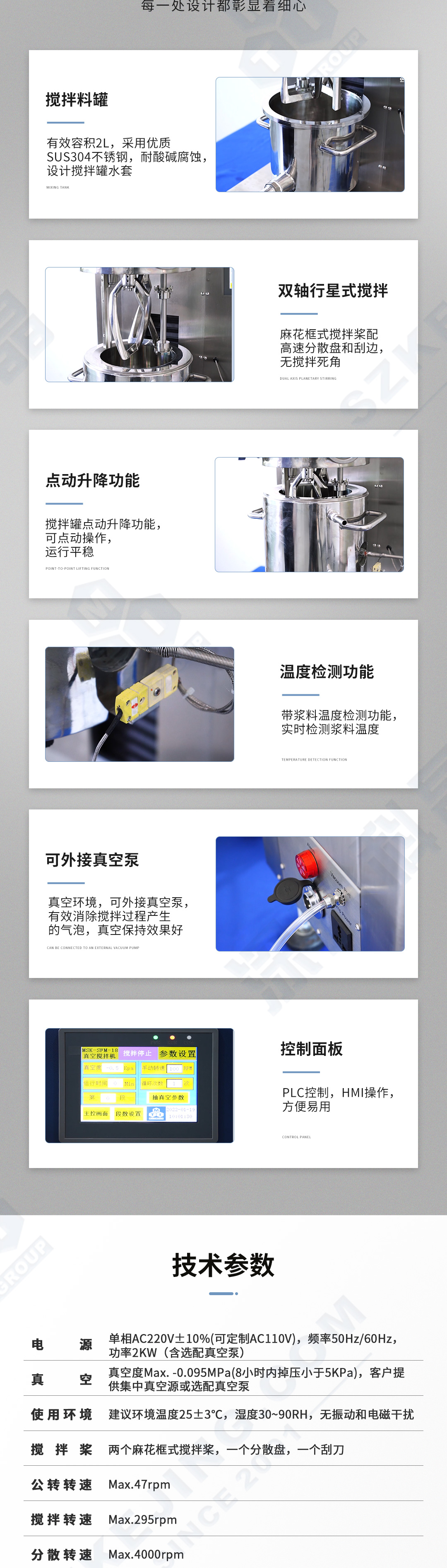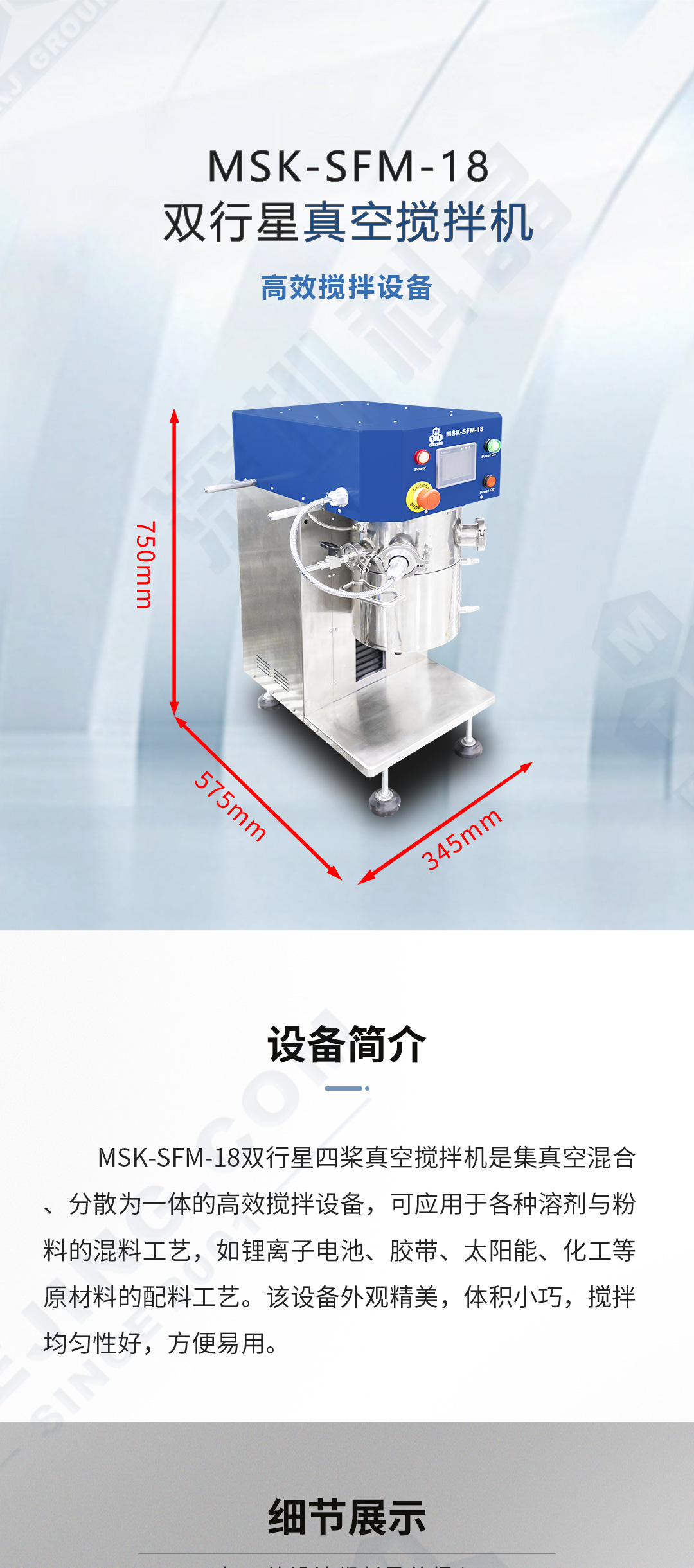 应用范围:MSK-SFM-18 双行星四桨真空搅拌机是集真空混合、分散为一体的高效搅拌设备,可应用于各种溶剂与粉料的混料工艺,如锂离子电池、胶带、太阳能、化工等原材料的配料工艺。该设备外观精美,体积小巧,搅拌均匀性好,方便易用。