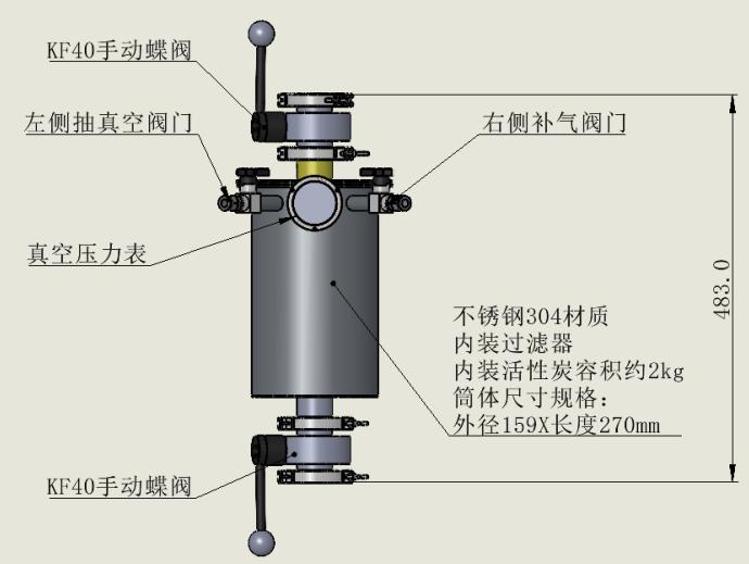 设计有手动蝶阀和抽补气阀门,方便取下更换活性炭, 不锈钢304材质, 活性炭容器外径约159mm,长度约270mm |