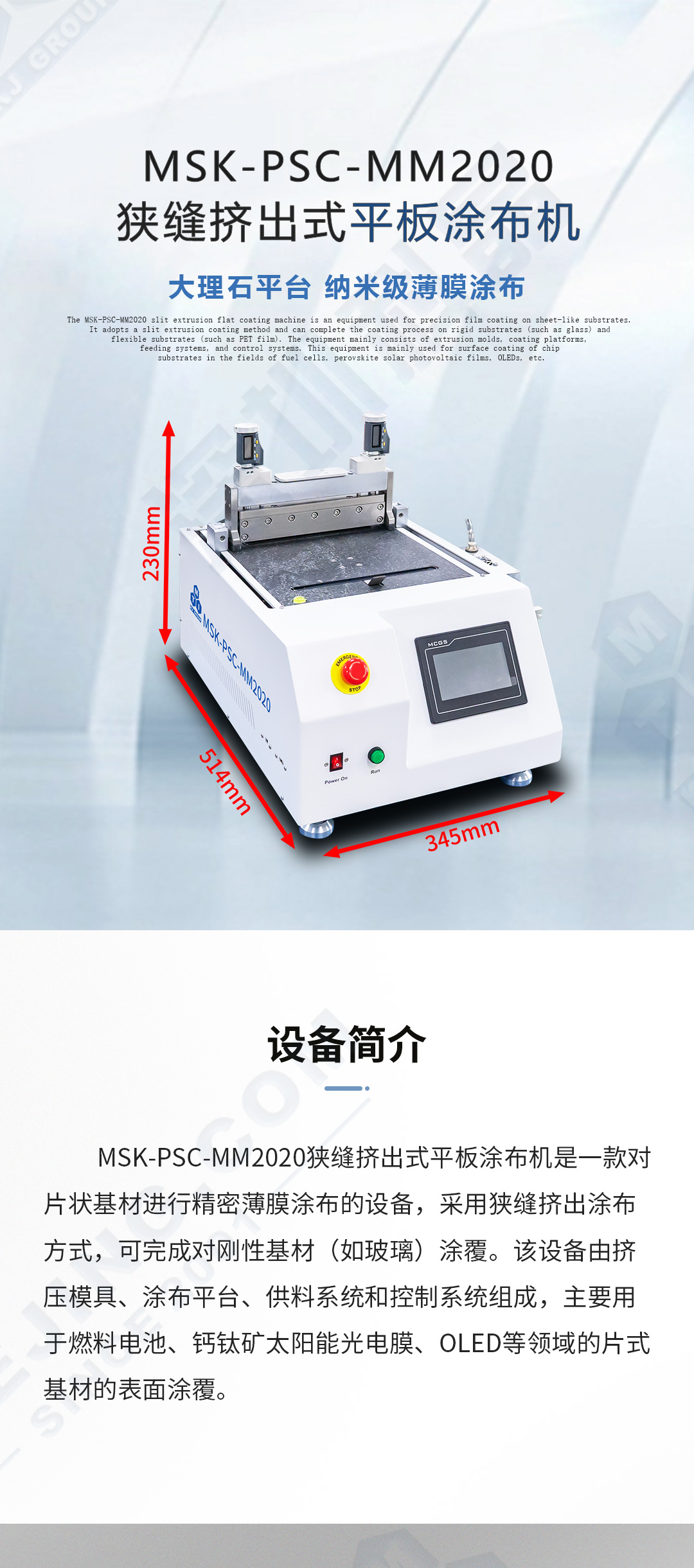 应用范围:MSK-PSC-MM2020狭缝平板涂布机是一款应用于针对片状基材进行精密薄膜涂布的设备,采用狭缝挤出涂布方式,可完成对刚性基材(如玻璃)的涂覆工艺。设备主要由挤压模具、涂布平台、供料系统和控制系统组成。该设备主要用于燃料电池、钙钛矿太阳能光电膜、OLED等领域的片式基材的表面涂覆。